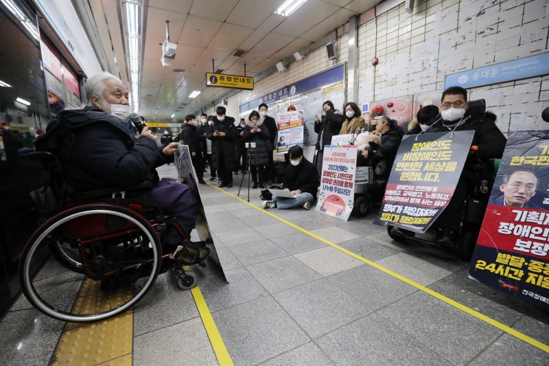 전장연은 장애인 권리 예산 보장을 요구하며 출근 시간대 서울 지하철에서 선전전을 진행 중이다.