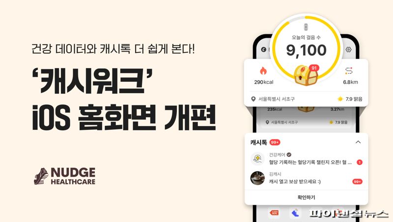 [파이낸셜뉴스] 넛지헬스케어가 운영하는 건강관리 슈퍼앱 ‘캐시워크’는 iOS 버전 홈 화면을 전면 개편했다고 25일 밝혔다. 이번 업데이트는 주요 건강 정보의 가시성을 높이고, 메신저·커뮤니티 기능인 ‘캐시톡’의 노출과 접근성을 강화하는 데 중점을 뒀다.