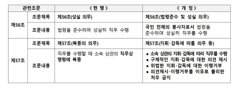 국가공무원법 제56조의 ‘성실 의무’도 ‘법령 준수 및 성실 의무’로 바뀌어 직무 기준이 법령 중심으로 더 명확해졌다.
