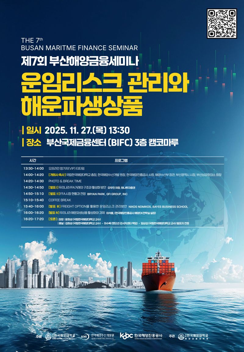 국립한국해양대학교 해양금융대학원 윤희성 원장은 "운임리스크 관리와 파생상품 활용 역량은 해운기업의 생존과 직결되는 중요한 요소"라며 "이번 세미나는 산업계·학계·정책기관이 한자리에서 미래 해양금융의 방향을 논의하는 뜻깊은 자리가 될 것"이라고 밝혔다.