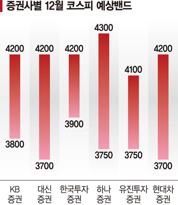 25일 국내 주요 증권사들이 제시한 12월 코스피 지수 전망치는 3700~4300p 선이다. 하나증권이 3750~4300를 예상해 상단이 가장 높았다.