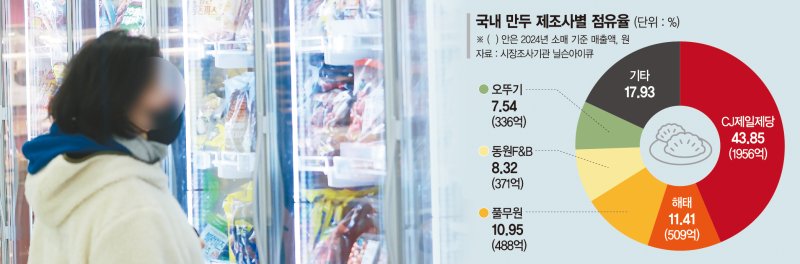 25일 시장조사기관 닐슨아이큐에 따르면 지난해 CJ제일제당의 냉동만두 매출액(소매점 기준)은 1956억원으로 전체 시장의 43.85%를 점유하고 있다. 국내 냉동만두 시장은 CJ제일제당의 비비고가 독주 체제를 이어가고 있는 셈이다.