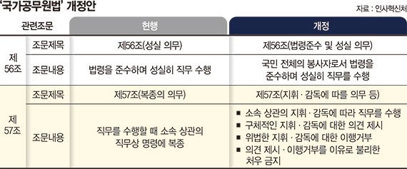 국가공무원법 제56조의 '성실 의무'도 '법령 준수 및 성실 의무'로 바뀌어 직무 기준이 법령 중심으로 더 명확해졌다.