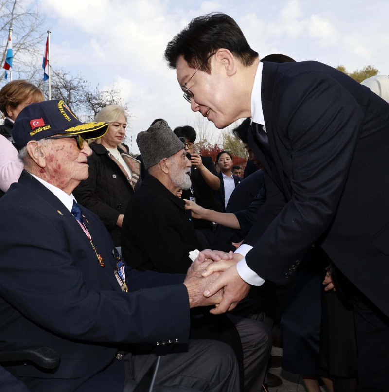 이 대통령 부부는 생존 참전용사 4명과 인사했다. 이 대통령, 악수 후 두 손을 잡으며 "감사하다"고 했고 한 참전용사 "튀르키예 땅에서 뵙게 돼 정말로 기쁘게 생각한다"고 답했다.