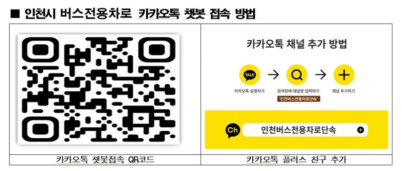 챗봇 서비스를 이용하려면 카카오톡 친구 목록 화면의 검색창에서 '인천버스전용차로 단속'을 검색해 플러스친구로 등록하거나 전용 정보무늬(QR코드)로 접속하면 즉시 서비스를 이용할 수 있다.