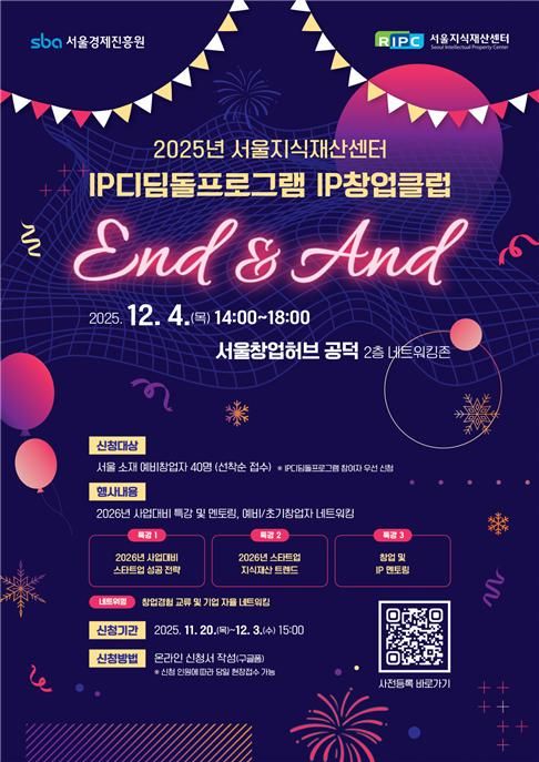 신정훈 진흥원 R&D지원본부장은 "End&And 행사는 예비창업자가 한 해 활동을 돌아보고 내년도 창업 전략을 구체화할 수 있도록 기획된 실전형 프로그램"이라며 "지식재산 기반 창업의 성장을 지원하는 다양한 프로그램을 통해 서울 창업생태계 활성화에 기여하겠다"고 말했다.