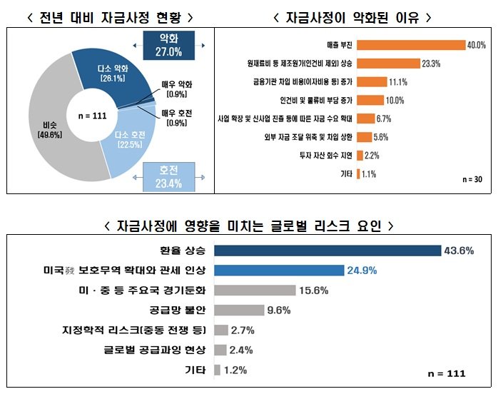 기업들은 고환율과 통상 불확실성 확대를 자금사정에 대한 가장 큰 대외 리스크 요인으로 지목했다.