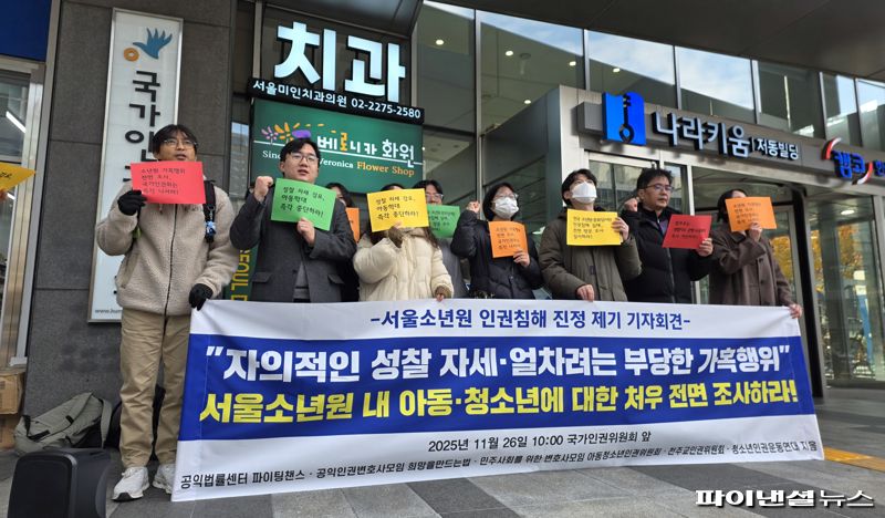임한결 변호사는 26일 오전 서울 중구 국가인권위원회 앞에서 열린 '서울소년원 인권 침해 진정제기 기자회견'에서 "교도소가 아닌 학교 시설임에도 이런 비인권적 행태가 이어지고 있다"며 이같이 말했다. 임 변호사는 서울소년원에서 체벌·가혹행위를 겪은 2009년생 피해자 A씨의 대리인을 맡아 국가인권위에 진정을 제기했다.