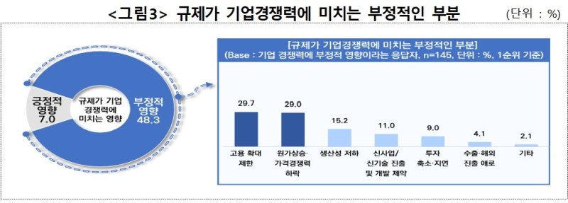 응답 기업들 48.3%는 규제가 기업 경쟁력에 부정적이라고 봤다. 긍정적이라고 답한 기업은 전체의 7.0%뿐이었다. 규제가 기업 경쟁력에 부정적이라고 밝힌 기업들은 고용 확대 제한(29.7%), 원가상승·가격경쟁력 하락(29.0%), 생산성 저하(15.2%)를 이유로 꼽았다.