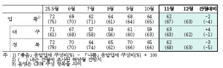 26일 한국은행 대구경북본부의 11월 기업경기실사지수(BSI)를 보면 대구·경북지역 제조업 업황 BSI가 전월 대비 2p 하락한 62로 2개월 연속 하락했다.