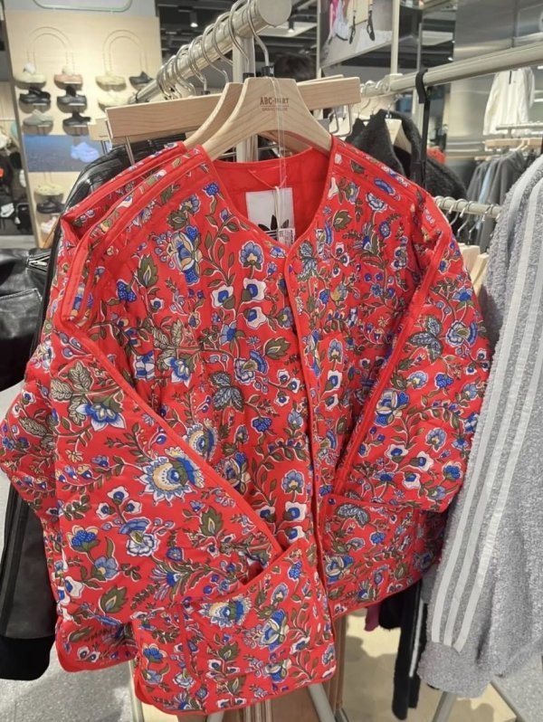 신상 재킷에는 밝은 빨간색 바탕에 꽃무늬가 그려져 있어 마치 '할머니 조끼'를 연상시키는 디자인이다.