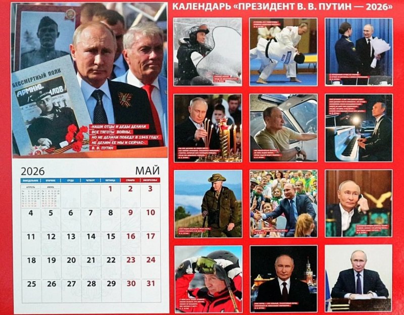 25일(현지시간) 뉴욕타임스(NYT)에 따르면 러시아 전역의 신문 가판대와 서점 등에서는 해마다 연말이면 다양한 버전의 푸틴 달력이 판매된다. 가격은 약 3.5달러(약 4700원)로, 학교와 우체국 같은 공공기관은 물론 일반 가정에서도 흔히 볼 수 있을 만큼 대중화된 '국민 달력'이다.