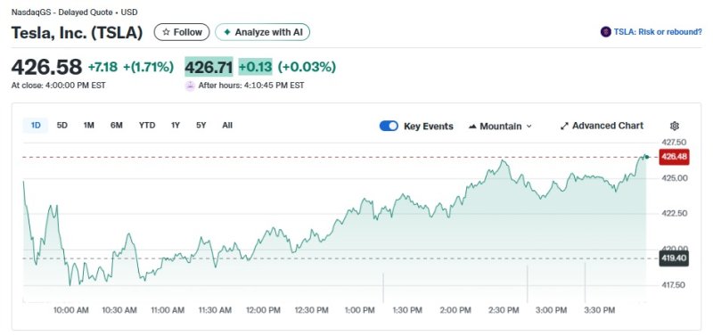 26일(현지 시각) 뉴욕증시에서 테슬라는 1.71% 상승한 426.58달러를 기록했다.