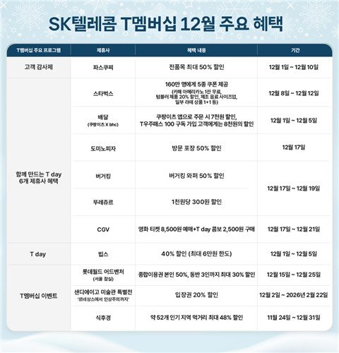 12월 T day에는 고객 투표로 선정된 스타벅스·도미노피자·버거킹·뚜레쥬르·CGV·쿠팡이츠 등 6개 제휴사가 참여한다.