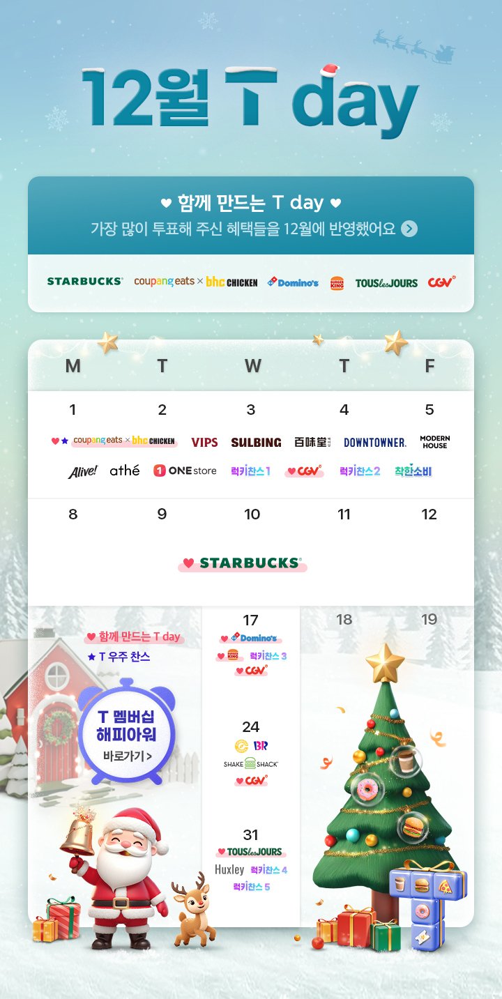 SK텔레콤은 투표 이벤트를 진행한 결과 스타벅스∙배달(쿠팡이츠X bhc)∙도미노피자∙버거킹∙뚜레쥬르∙CGV 등 6개 제휴사와 12월 'T day' 이벤트를 선보인다.