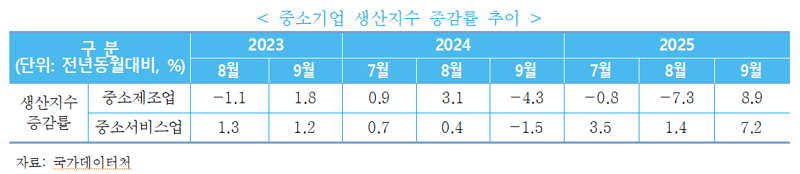 27일 중소벤처기업연구원이 발표한 'KOSI 중소기업 동향 2025년 11월호'에 따르면 9월 중소제조업 생산은 전년 동월 대비 8.9% 증가했다. 조업일수 확대에 더해 반도체·자동차 등 수출 호조가 실적을 견인했다.