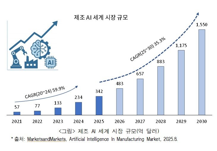 제조 AI 시장은 2030년 1550억 달러 규모로 급성장할 전망이며, 미국 GE, 유럽 지멘스, 일본 화낙, 중국 화웨이 등 세계 각국과 기업들은 생산 자동화 및 공정 지능화에 적극 투자하고 있다. 우리나라 정부도 'AI 팩토리' 정책으로 제조 공정의 자동화·지능화를 가속화하고 있으며, 삼성전자, 두산로보틱스 등 국내 기업들은 AI·로봇·디지털트윈 융합형 스마트팩토리 구축에 힘쓰고 있다.