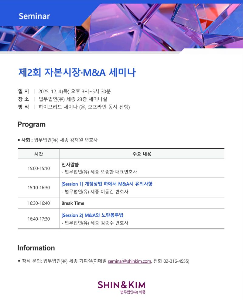 세종 오종한 대표변호사는 “개정상법, 노란봉투법 등 제도 변화로 인해 기업들이 직면한 과제가 더욱 복합해지고, 전략적 판단의 중요성도 한층 커지고 있다”라며, “이번 세미나를 통해 자본시장과 M&A 환경 변화의 핵심을 정확히 짚어보고, 실무적으로 필요한 방향성을 함께 모색하는 유익한 자리가 되길 바란다”라고 전했다.