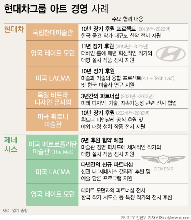 업계 관계자는 "현대차그룹의 아트 경영은 글로벌 미술 생태계와 기업 전략을 연결하는 독특한 구조로 확실히 자리잡았다"며 "현대차가 미래 모빌리티 기업을 넘어, 창의성 기반의 글로벌 브랜드로 이동하게 하는 중요한 축이다"고 말했다.