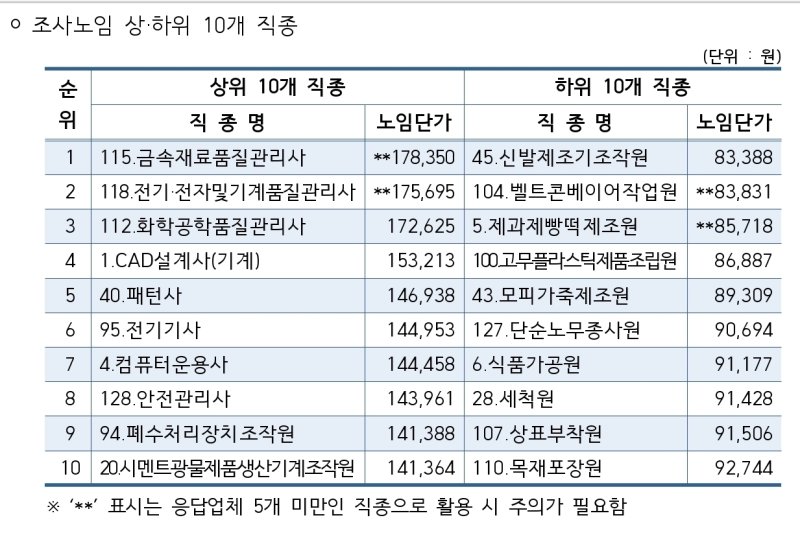 금액순으로는 '금속재료품질관리사'의 평균일급이 17만 8350원으로 가장 높았고 '신발제조기조작원'이 8만 3388원으로 가장 낮았다.
