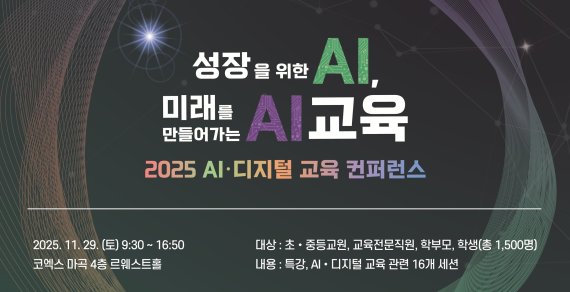 이번 컨퍼런스에는 교사·학교경영자·교육전문직·학부모·학생 등 약 1500여명이 참여하며, '성장을 위한 AI, 미래를 만들어 가는 AI 교육'을 주제로 비전 특강과 16개 세션을 운영한다. 이를 통해 AI·디지털 기반 우수 교육사례를 공유하고, 학교 현장에서 실천 가능한 수업 혁신과 정책 방향을 논의할 예정이다.