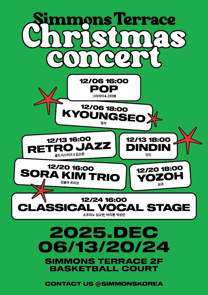 콘서트는 12월6·13·20·24일 총 4일에 걸쳐 시몬스 테라스 2층 바스켓볼 코트에서 열린다. 6·13·20일에는 오후 4시와 오후 6시, 24일에는 오후 4시 한 차례만 진행한다.