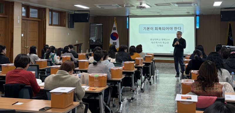 이날 연수에서는 한국분석기술연구소장이자 충남대학교 화학과 명예교수인 이계호 교수를 초빙하여 ‘당신을 살리는 건강한 먹거리’라는 주제로 특강을 진행하였으며, 이어 한국 전통 토종균주(고초균)를 활용한 간장·된장 만들기 체험 하면서 전통 발효식품의 우수성과 급식 현장에서의 적용 가능성을 함께 탐색하는 시간을 가졌다.