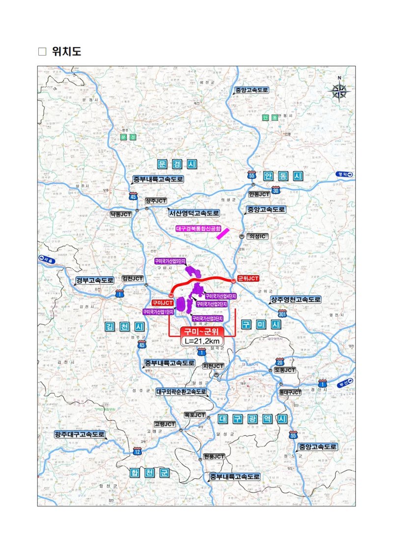 구미~군위 고속도로는 구미에서 군위군 효령면(중앙고속도로)까지 총 21.2㎞ 구간을 4차로로 신설하는 사업이다. 사업비는 약 1조 5627억원 규모다.