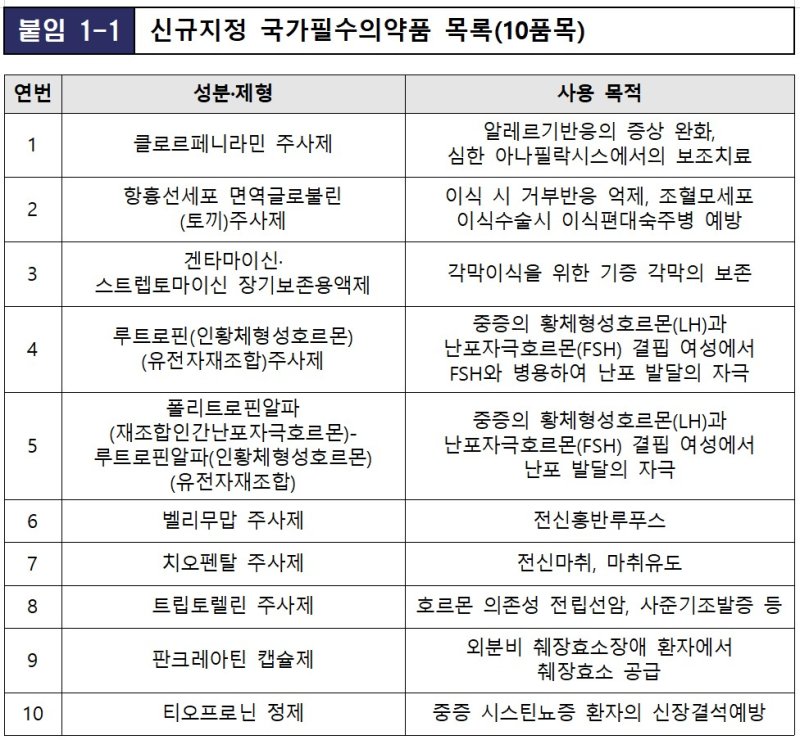 이번 협의회를 통해 국가필수의약품으로 신규 지정된 의약품은 난임 시술 시 난포 발달을 자극하는 목적으로 사용하는 '루트로핀 주사제' 등 난임치료제와, 면역억제가 필요한 응급상황 등에서 보조치료 목적으로 사용되는 '클로르페니라민 주사제', 전신마취 시 적용가능 범위가 넓은 '치오펜탈 주사제' 등이다. 안정공급 지원 필요성이 높은 의약품에 해당된다.