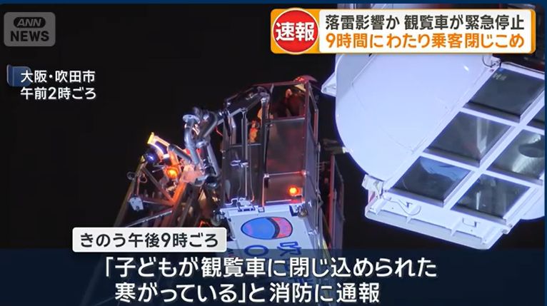 [파이낸셜뉴스] 일본 오사카의 대관람차가 벼락을 맞고 멈춰 승객 수십 명이 최대 9시간 고립됐다.