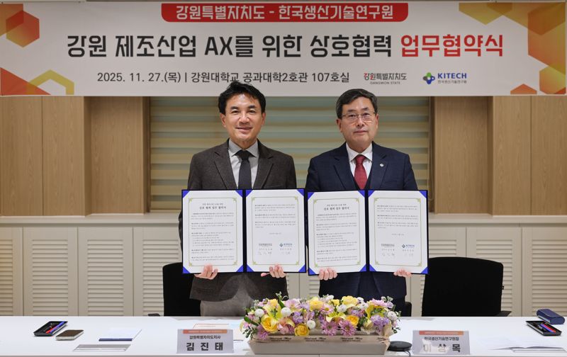 강원도는 27일 강원대에서 강원 제조산업의 AX(인공지능 전환)를 위한 상호 협력을 강화하기 위해 한국생산기술연구원과 업무협약(MOU)을 체결했다.