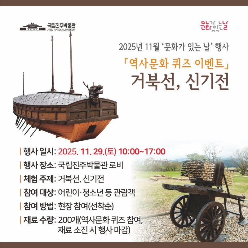 행사 당일 박물관을 찾은 어린이, 청소년 등 관람객은 별도 예약 없이 퀴즈에 참여해 체험 재료 1종(‘거북선’ 또는 ‘신기전’)을 받을 수 있다(200개 선착순 제공). 거북선과 신기전은 국립진주박물관 전시실과 로비에서 관람할 수 있다.
