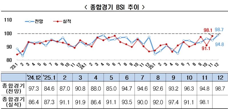 12월 조사 부문별 BSI는 내수(98.1)·수출(97.3)·투자(95.0)를 비롯한 전 부문에서 부정 전망이 나타났다. 전 부문 부진은 지난해 7월 이후 1년 6개월째 이어지고 있다.