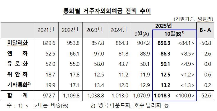 28일 한국은행이 발표한 ‘2025년 10월 중 거주자외화예금 동향’에 따르면 지난 10월말 기준 외국환은행의 거주자 외화예금은 1018억3000만달러로 집계됐다. 전월 말 대비 52억6000만달러(4.9%) 줄어든 수치다.