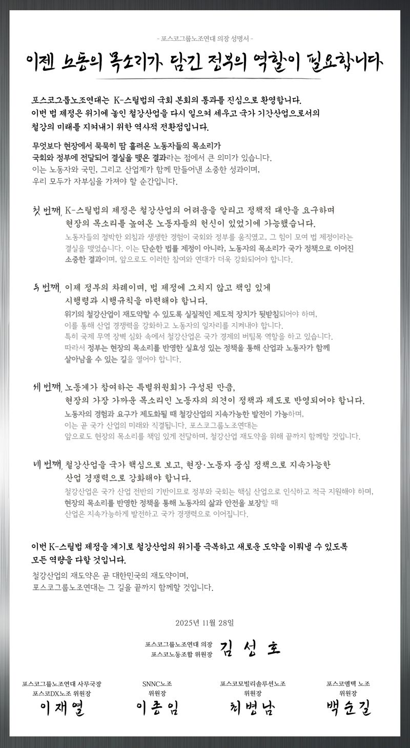마지막으로 “철강산업의 재도약은 곧 대한민국의 재도약이다. 포스코그룹노조연대는 그 길을 끝까지 함께할 것”이라고 밝혔다.
