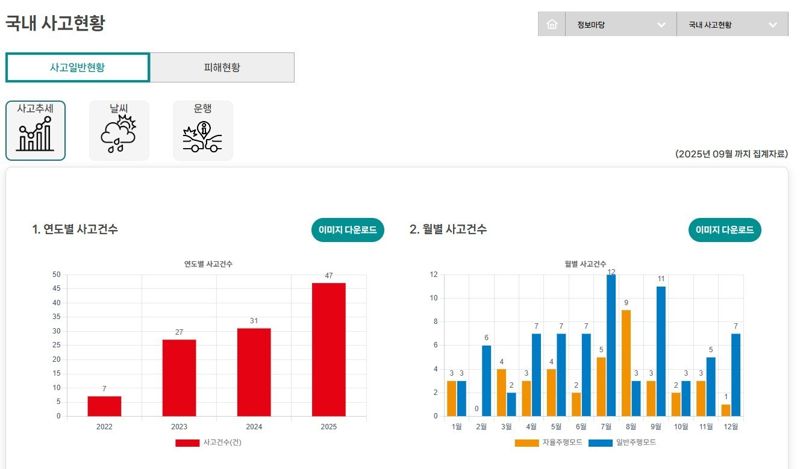 TS는 제작사가 제출한 자율주행차 교통사고 신고서를 바탕으로 연도, 운행모드, 시간대, 날씨, 주행상태, 파손정도 등 10개 항목의 통계를 마련했다. 자율주행차 사고는 2022년 7건에서 2025년 9월 기준 47건으로 5.7배 증가했다. 이 가운데 자율주행모드 사고는 전체의 약 35%를 차지했다.