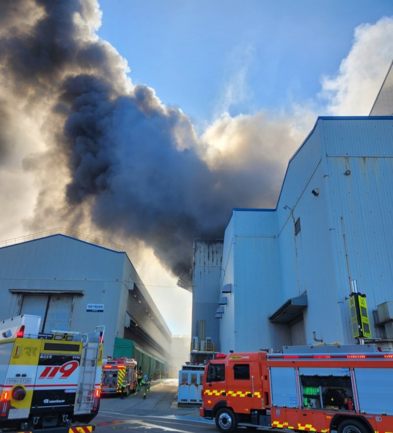 [울산=뉴시스] 박수지 기자 = 28일 오전 11시 43분께 울산 동구 일산동 HD현대일렉트릭 공장에서 화재가 발생했다.