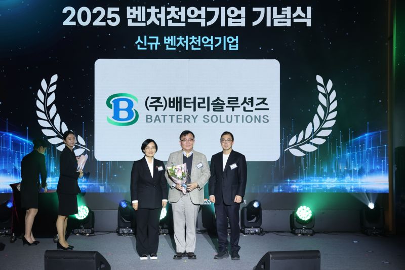 배터리 재활용 전문 기업인 배터리솔루션즈는 지난 27일 중소벤처기업부와 벤처기업협회가 서울 서초구 엘타워에서 개최한 ‘2025 벤처천억기업 기념식’에 참석해 한성숙 중기부 장관으로부터 기념 트로피를 받았다.