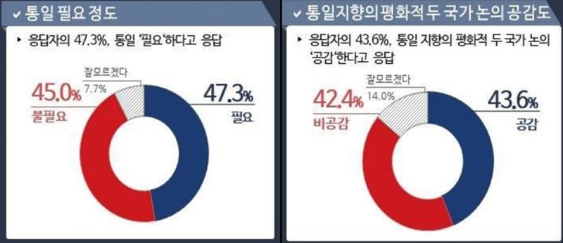 통일이 필요한 이유로는 '경제 발전과 국제적 위상 강화'(45.0%),'전쟁 위협 해소'(30.4%)를 많이 골랐으며, 통일 불필요 이유로는 '정치·사회적 혼란'(50.4%)과 '경제적 비용 발생'(38.2%)이라는 답이 많았다.