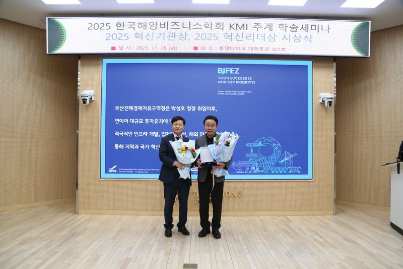 [파이낸셜뉴스] 부산진해경제자유구역청은 28일 동명대학교에서 열린 2025 한국해양비즈니스학회·한국해양수산개발원(KMI) 추계 학술세미나에서 ‘2025 올해의 혁신기관상’을 수상했다고 밝혔다.