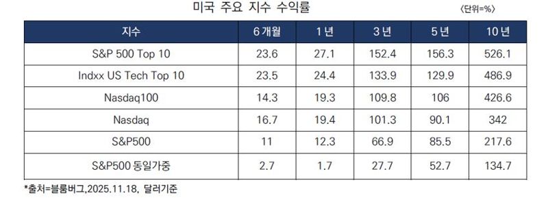 반면 S&P500(동일가중) 지수는 10년 수익률이 134.7%로 분석 대상 지수 중 가장 낮았다. 다양한 종목에 골고루 투자한 분산 효과가 오히려 시장 내 ‘승자독식’ 구조에서는 상대적으로 낮은 성과로 이어진 것으로 풀이된다.