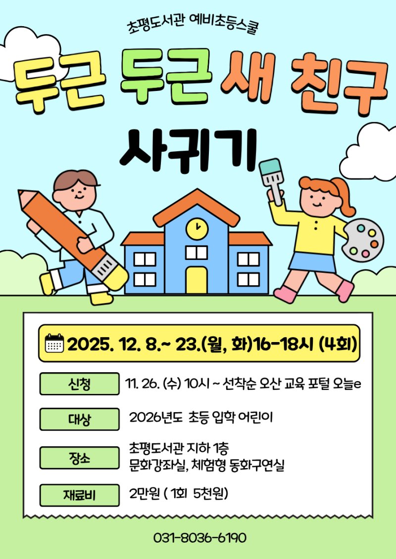 '예비초등스쿨'은 2026년도 초등학교 입학 예정인 미취학 어린이 10명을 대상으로 하며 교과 연계 도서를 활용한 창의적 독후 활동과 체험형 동화구연을 제공한다.