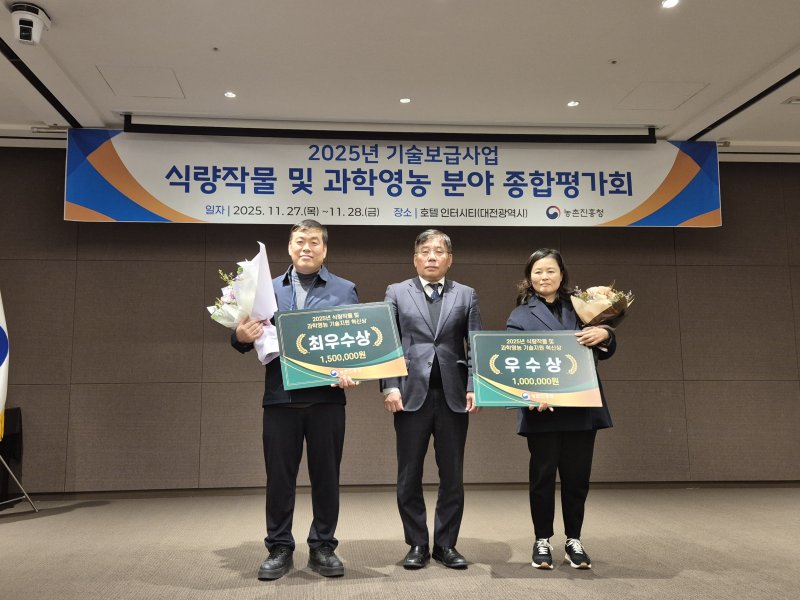 [진주=뉴시스] 정경규 기자 = 경남도농업기술원은 대전 호텔 인터시티에서 열린 2025년 식량작물 및 과학영농분야 기술보급사업 종합평가회에서 식량작물 및 과학영농분야 기술지원 혁신상 ‘최우수상(1위)’을 수상했다고 28일 밝혔다.
