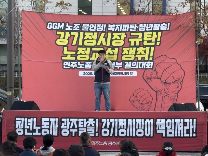 민주노총 광주본부는 28일 광주시청 앞에서 결의대회를 열고 "광주시가 지역 최대 노동 현안인 GGM 문제를 비롯해 여러 현안을 두고 회피하고 있다"고 규탄했다.