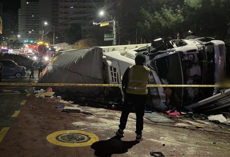 (서울=연합뉴스) 이율립 기자 = 28일 오후 10시 44분께 서울 금천구 시흥동에서 수산물을 실은 4.5t 냉동 탑차가 내리막길에서 옆으로 넘어지는 사고가 났다.