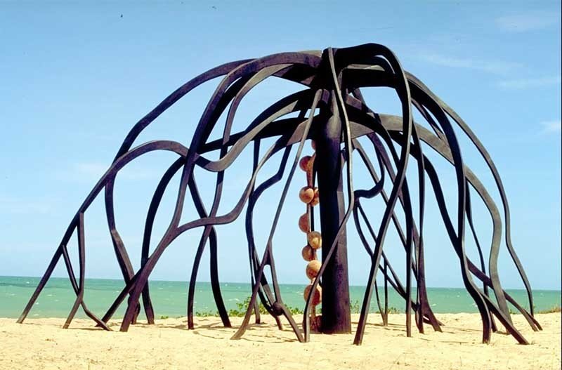 모래사장 위에 세워진 그의 조각은 거대한 나무뿌리가 뒤집힌 형태를 하고 있다. 중심 기둥에서 수십 가닥의 뿌리 같은 구조가 사방으로 흘러내리며, 표면은 불길에 그을린 흔적처럼 검게 변색돼 있다. 일부는 휘고 꺾여 있어 실제 화재 지역에서 목격되는 나무 잔해와 거의 유사한 형태를 띤다. 내부에 줄지어 매달린 구형 덩어리는 생명 씨앗처럼 보이지만, 파괴되고 남은 잔해를 연상시킨다. 잿빛 조각은 그 너머 잔잔한 바다와 대조되며, 아마존 파괴가 남긴 풍경의 이중성을 드러낸다.