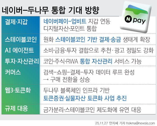 양사 결합은 국내 IT·금융 업계 지형도를 뒤흔들 '빅딜'로 평가받는다. 네이버의 플랫폼 경쟁력(검색·쇼핑·페이)과 두나무가 보유한 블록체인 기술력이 하나로 합쳐지기 때문이다.