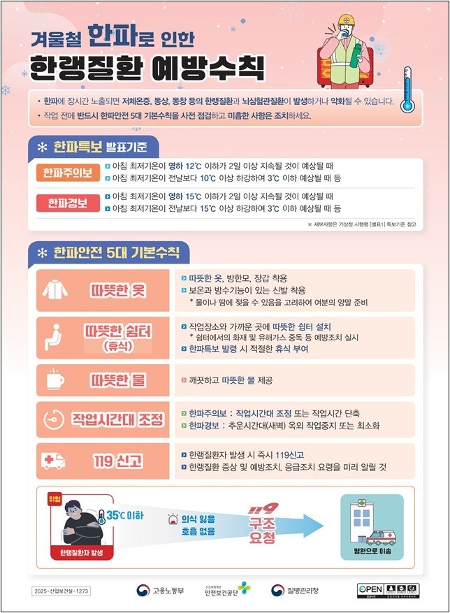 현장 점검 시 18개 언어로 제작한 '한파안전 5대 기본수칙' 등을 외국인 노동자와 사업주에게 제공하고, 동상·저체온증 등 예방을 위한 핫팩·귀덮개 등 한랭질환 예방 보조용품도 지원한다.
