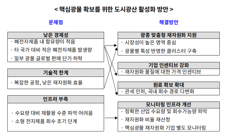 보고서는 이러한 한계를 극복하고 우리나라의 도시광산을 활성화하기 위해 △광물별 특성에 맞춘 재자원화 클러스터 조성 △차액 계약, 가격 상·하한제 등 재자원화 물질 가격 안정장치 마련 △국내 회수경로 확대 및 재자원화 원료 관세 완화 △정확한 산업 수요·회수가능량을 파악할 수 있는 국가 모니터링 체계 구축 등을 제안했다.