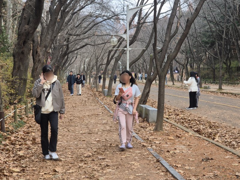 반대로 공원 풍경은 겨울을 맞을 준비가 한창이었다. 단풍으로 물들었던 나무들은 나뭇잎이 모두 떨어져 앙상한 가지를 드러냈다. 흙길 산책로는 바람에 밀려온 낙엽으로 뒤덮여 가을의 끝자락을 보여주고 있었다.